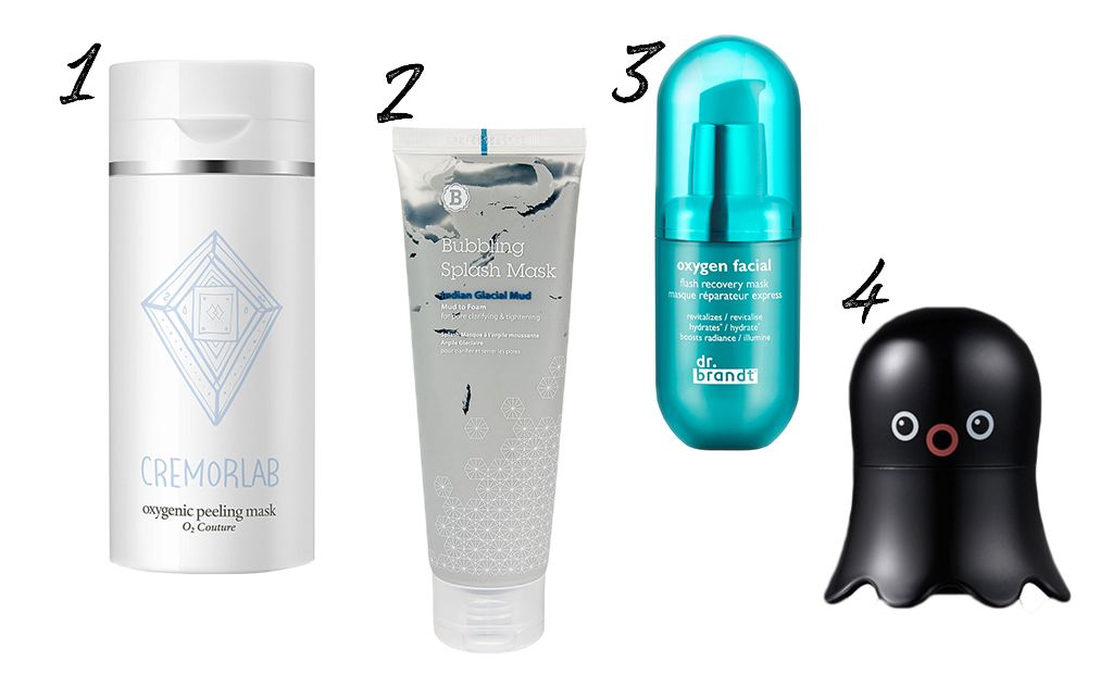 1 – oчищающая кислородная маска для лица Cremolab, 2 – oчищающая пузырьковая глиняная сплэш-маска для лица Blithe, 3 – кислородная маска-флэш для лица dr.brandt, 4 – пузырьковая маска для очищения пор Tony Moly