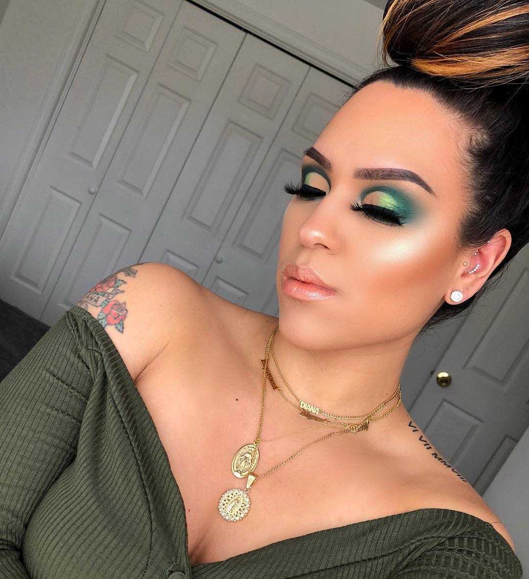 Для повседневного макияжа целесообразно использовать тени золотистого, бежевого и шоколадного оттенков. Они делают глаза более выразительными на фоне зеленого платья, а вот тени в тон платья придадут лицу тусклый вид.