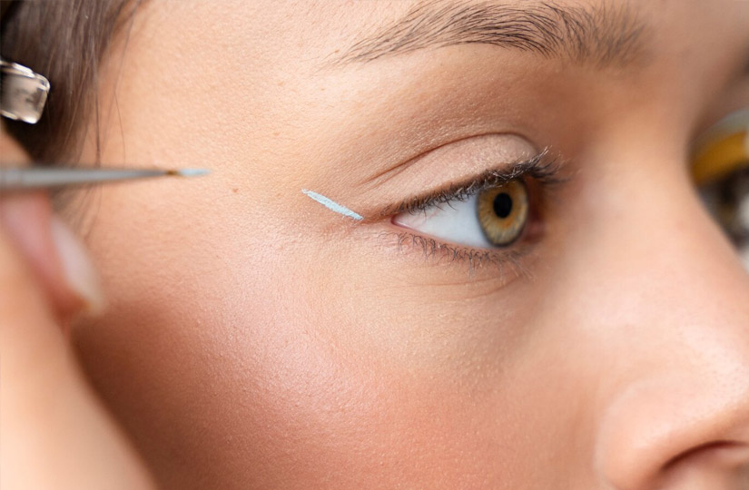 д.), и скошенной тонкой кистью они наносятся строго по линии роста ресниц. После, как лайнером, выводится тонкий хвостик за пределы подвижного века;
