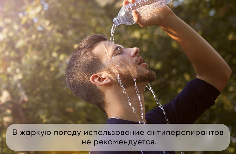 В жаркую погоду использовать антиперспиранты не рекомендуется. Пот – это защита организма от перегрева, и, лишаясь этой защиты, человек может испытать такие неприятные симптомы, как одышка, аритмия или даже обморок. Помимо этого, закупорка потоков иногда вызывает воспалительные процессы. Большинство специалистов рекомендует давать подмышкам «отдых» от антиперспирантов и тщательно очищать их после использования таких средств.