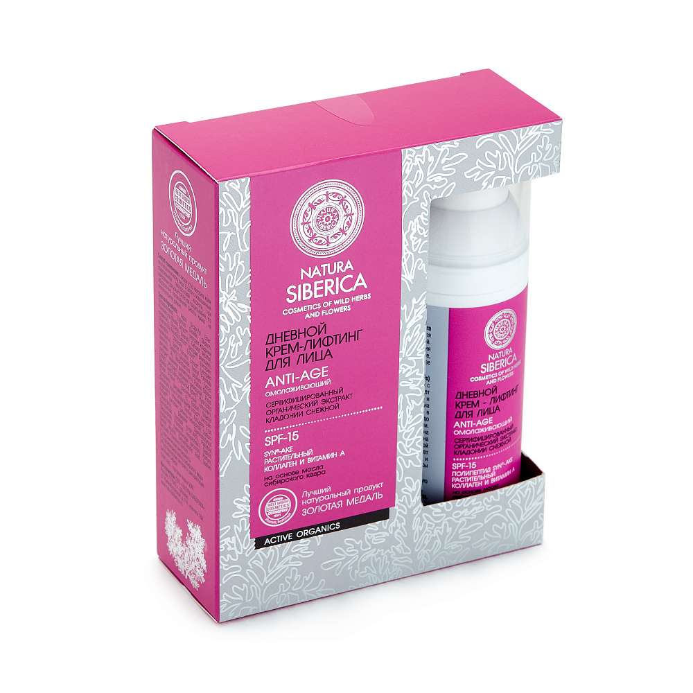 Дневной крем-лифтинг для лица Anti-Age Натура Сиберика имеет в составе множеством полезных элементов, оптимальным образом предназначенных для восстановления здорового и молодого состояния кожи. Так, витамин А предназначен для активизации естественного восстановления клеточной структуры кожи, для защиты от ультрафиолетовых лучей используется система SPF-15, а для восстановления упругости кожи — натуральный растительный коллаген.