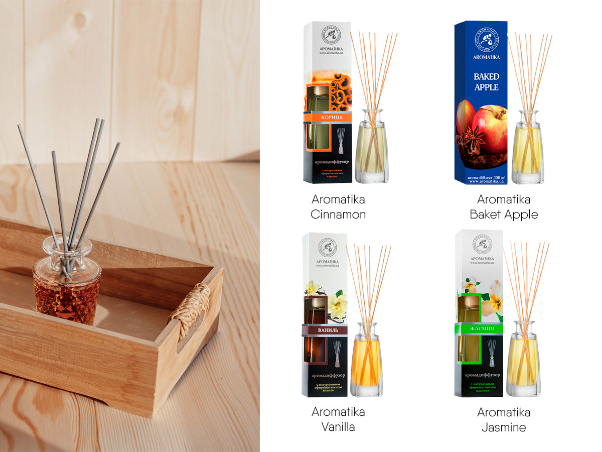 Диффузоры — сосуд с арома-жидкостью и несколькими специальными палочками, которые вставляются в емкость. Палочки пропитываются жидкостью и дают тот самый запах. Добавляя или убирая палочки можно регулировать степень концентрации аромата. Так, диффузор подойдет для ароматизации любой комнаты в доме: гостиная, зал, спальня.