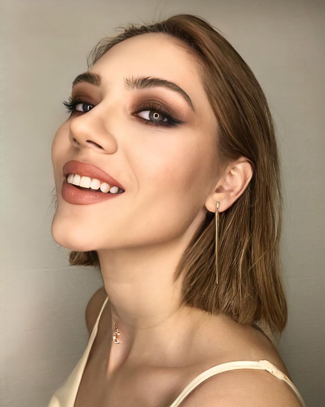 Такой макияж в стиле смоки выполняется на базе мягких и спокойных тонов, которые не будут привлекать неуместное внимание. Оптимальное сочетание – серо-коричневая тональность, она подойдет большинству цветотипов