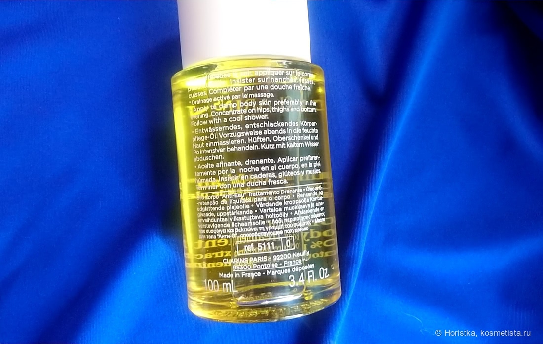 Производитель рекомендует использовать средство по следующей схеме: для начала необходимо нанести масло на сухую или влажную кожу (я наношу сразу на влажную), после чего рекомендует слегка помассировать кожу, а уже после смыть остатки масла водой. Хм… только помассировать? У меня в бой всегда идут дополнительные средства, это антицеллюлитная банка и массажная щетка с щетиной из кактуса. Каждый раз, когда я использую это масло, я сначала легкими движениями разогреваю кожу, а уже после приступаю к тщательному массажу одним из средств в течение 5-10 минут. После чего я прохожусь по своим ногам и бедрам контрастным душем и даю остаткам масла полностью впитаться в кожу. В это время по всей моей душевой стоит сумасшедший аромат различных эфирных масел и трав, которые очень расслабляют и успокаивают, не только мою кожу, но и меня. Как результат, за полгода использования масла Anti-Eau и своих массажных приспособлений мне удалось полностью избавиться от целлюлита на своих ногах и бедрах. Масло действительно способствует выведению лишней жидкости из тканей вместе с жировыми отложениями, а также оно отлично укрепляет и тонизирует кожу.