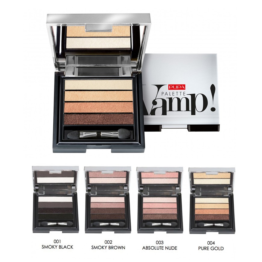 Vamp! Palette от Pupa в оттенках 002 Smoky Brown, 003 Absolute Nude и 004 Pure Gold также радуют своих обладательниц высокой пигментацией и удачным сочетанием цветов в небольшой палетке на 4 оттенка.
