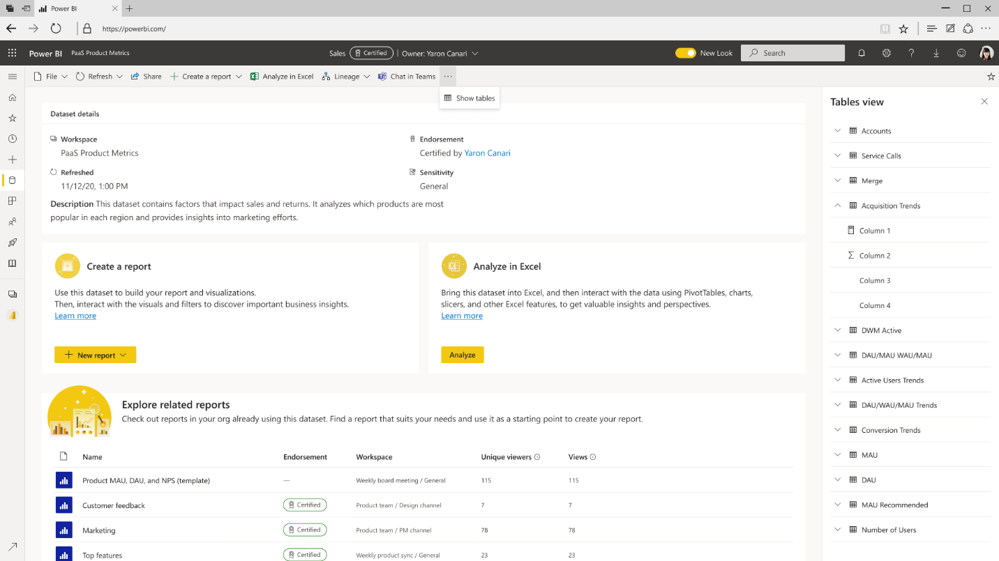 - Tables view. An essential piece of dataset metadata is the dataset’s tables and their columns and measures. With this improvement you no longer need to open a dataset in Power BI Desktop as it is all available as part of the dataset details page.