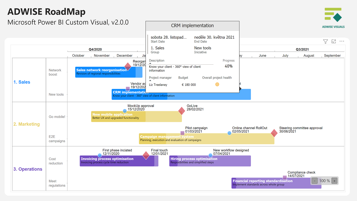New version of popular and certified road mapping visual is out – much wanted zoom/scroll functionality added. Plan, roadmap, and time schedule phases and milestones using ADWISE RoadMap. This visual can help you present your project, product, or campaign plans, or visualize whatever else that can be time-scheduled.