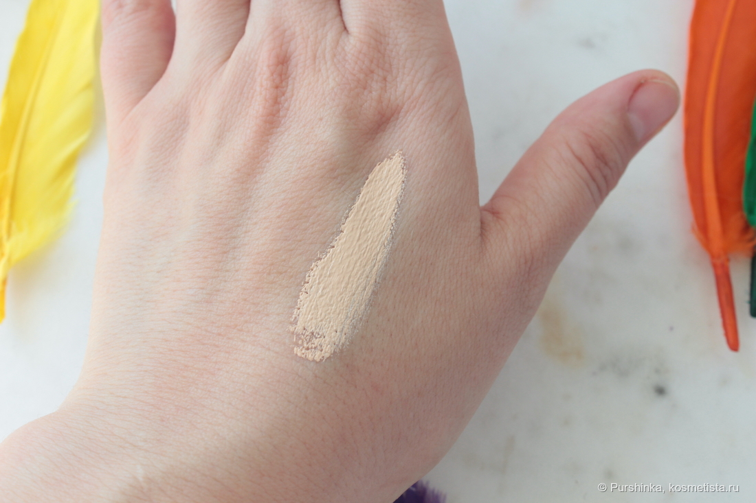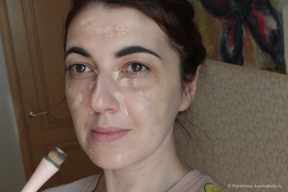 Спонж у консилера очень крупный. Если честно, то я даже не знаю зачем он такой огромный, можно было бы сделать поменьше. По консистенции консилер плотнее, чем те, что у меня были ранее, но при этом он отлично наносится на кожу и вбивается кистью в кожу. Кисть я использую круглую Ecotools, это моя лучшая находка для нанесения консилеров ever.