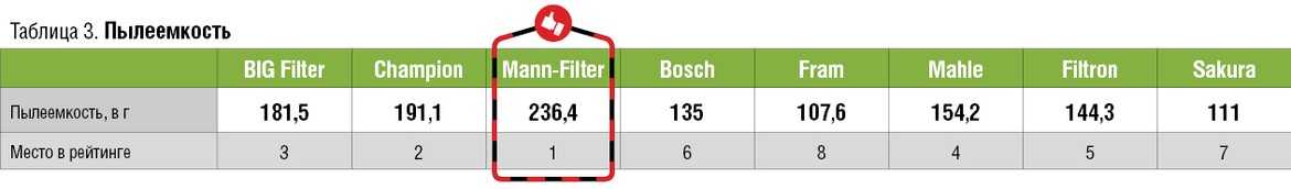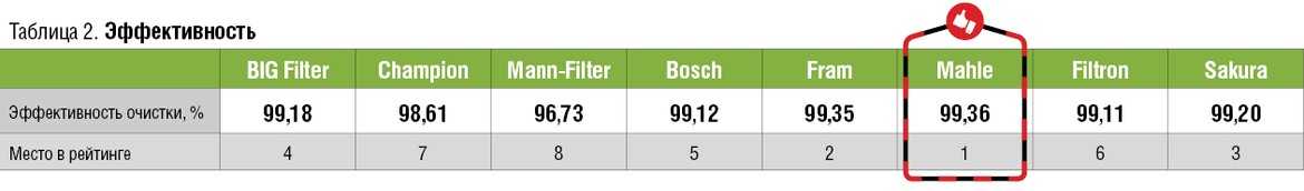 Второе место делит целая группа фильтров, параметры которых достойны хорошего отзыва, хотя каждый из них и не является лидером в отдельных испытаниях. Это продукция BIG Filter, Mann-Filter и Champion. Отметим, что BIG Filter при хороших результатах имеет самую низкую цену. А если бы не досадный проигрыш Mann-Filter по эффективности, возможно, и лидер этого теста был бы другим.