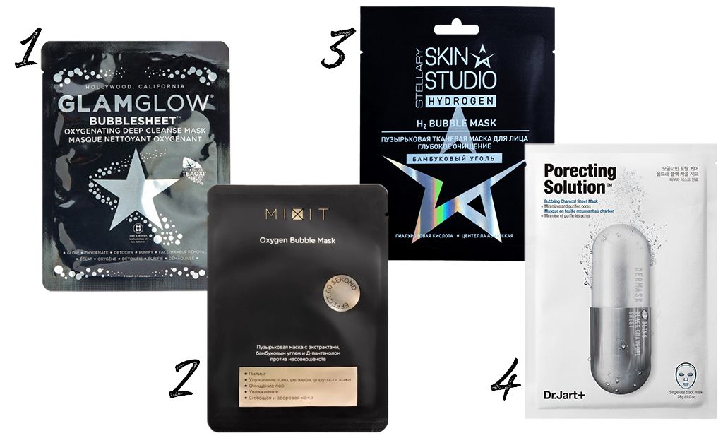 1 — очищающая пузырьковая маска GlamGlow, 2 — пузырьковая тканевая маска против несовершенств Mixit, 3 — пузырьковая тканевая маска для лица «Глубокое очищение кожи» Stellary, 4 — пузырьковая маска «Капсулы красоты» для интенсивного очищения и сужения пор dr.Jart