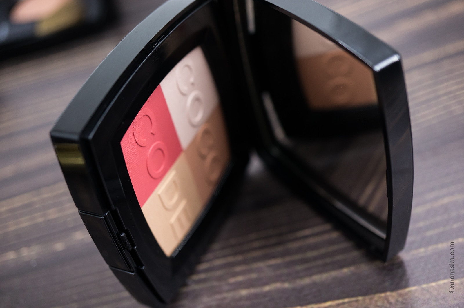 Четыре сектора этой палетки — коралловые румяна, розовый хайлайтер, золотистый хайлайтер и бежевый бронзер — можно смешивать между собой, либо набирать по раздельности. Первым делом палетка напомнила мне сразу две палетки Шанель. Левая половина, по первым ощущениям, так просто копия Chanel Les Beige Healthy Glow Multi Colour Duo 1 Contour and Blush
