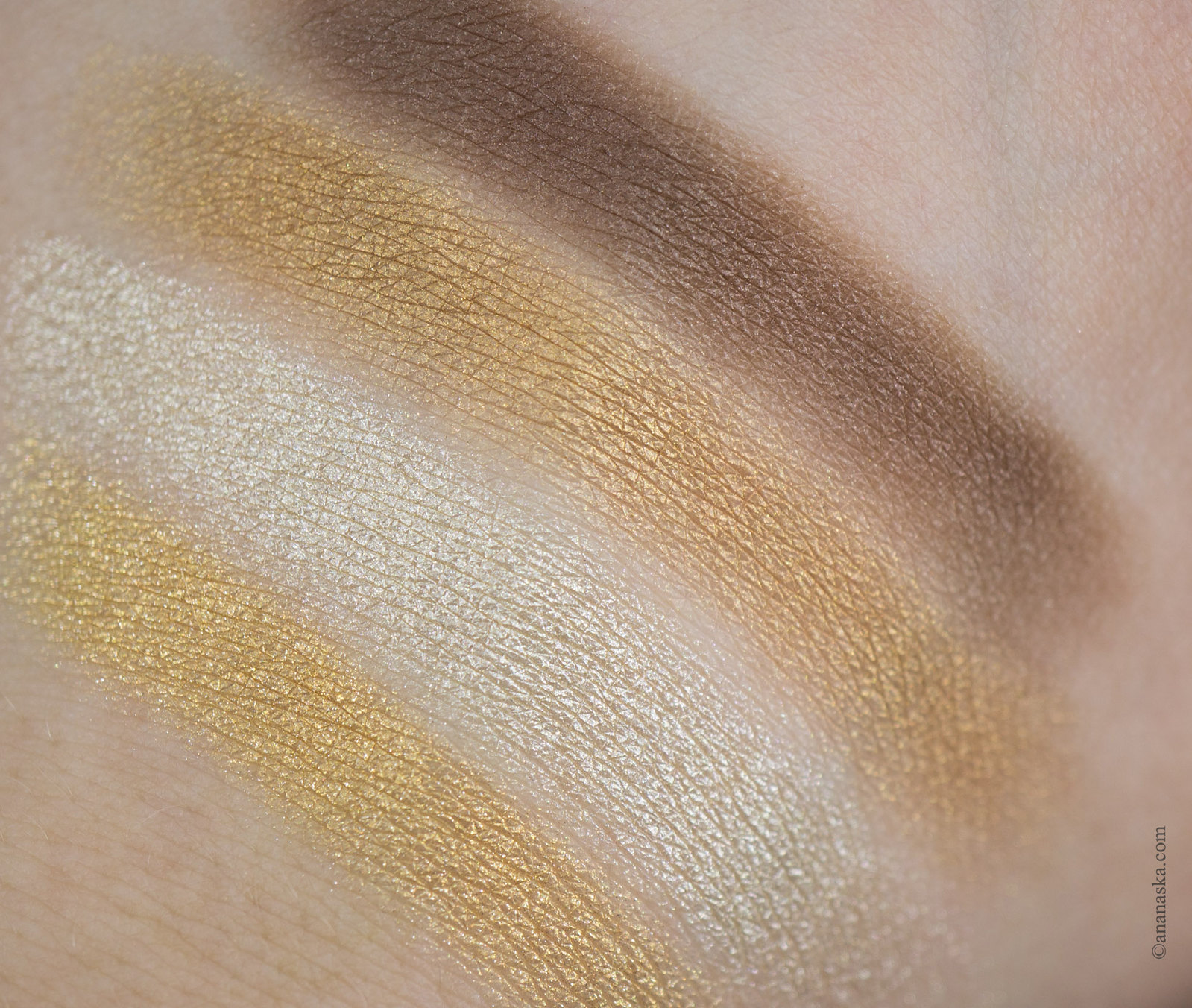 Я, конечно, знаю, что тени, особенно запеченные, свотчатся иногда очень плохо, но я очень старалась и втирала подушечками пальцев, чтобы хоть что-то можно было сфотографировать. В общем, как-то так. Они очень бледные, все цвета светлые, “креативно” употребить их, на мой взгляд, будет непросто.