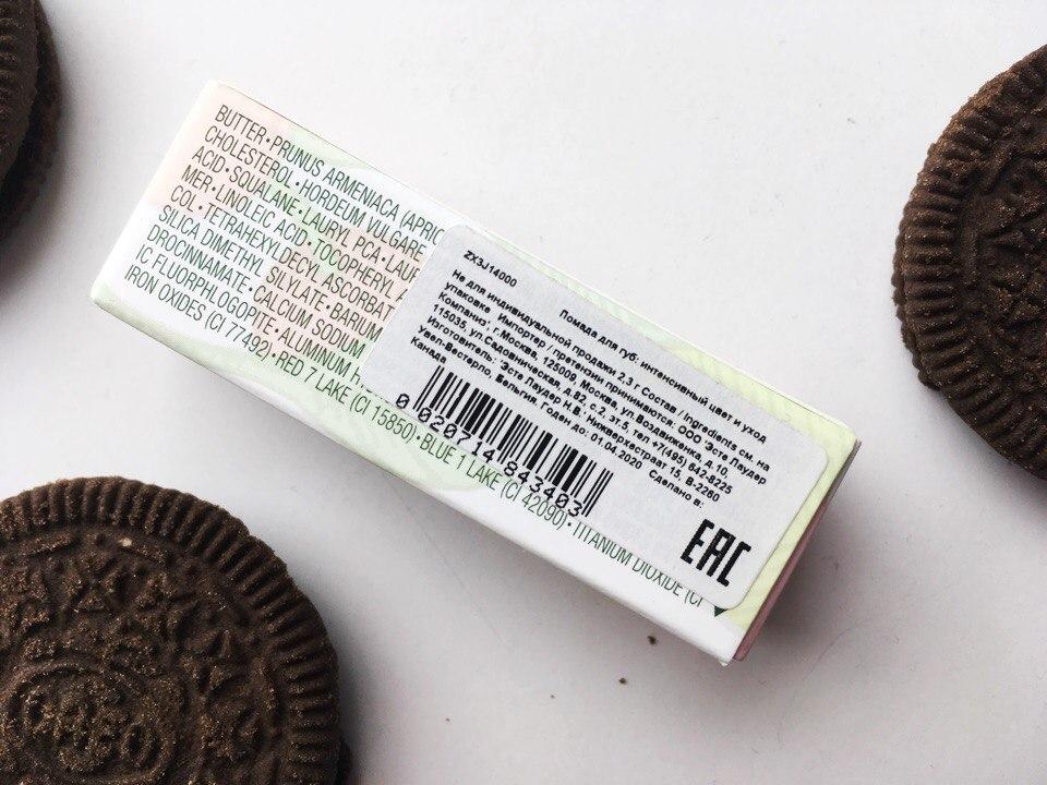 Выкручивается помада хорошо, без затруднений. Колпачок закрывается плотно, но прилагать большие усилия для его открытия не нужно. Ношу помаду в сумочке без опасений, что она может открыться и запачкать всё вокруг. На дне флакончика наклеен круглый стикер, на котором большим шрифтом указан номер и название оттенка, а мелким всё остальное: производитель, номер партии и прочая информация.