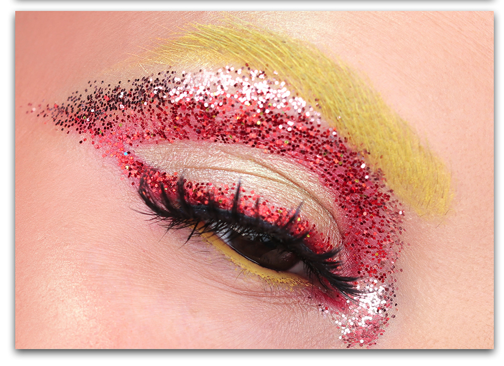 Она прокрашивала скорее волоски, чем кожу под ними: в то время как я пользуюсь кисточкой для теней, чтобы нанести все блестящее, она нанесла смесь из воска и теней щеточкой для туши, очень аккуратно — и тем же способом потом добавила блестки.