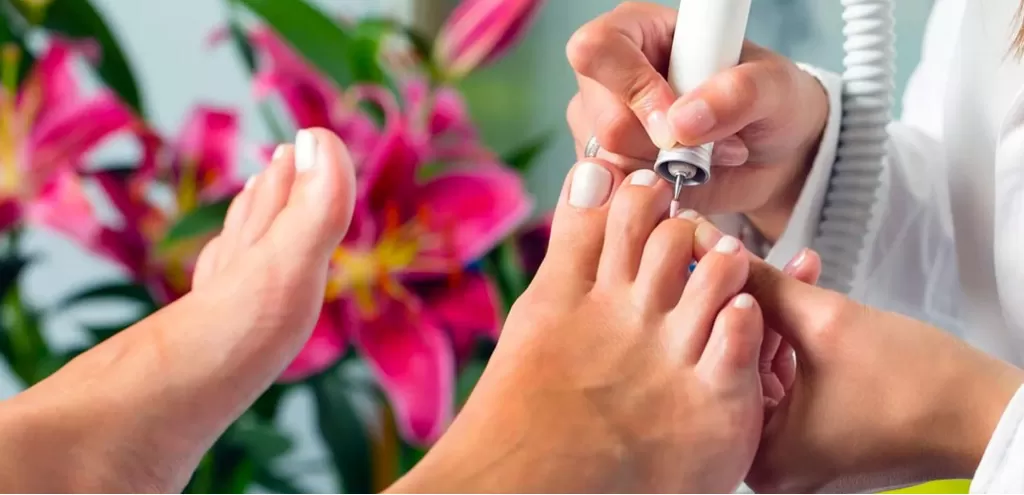 - Отсутствию необходимости распаривания – для приведения ножек в порядок достаточно обработать их фрезой около 10 минут. Все оставшееся время процедуры специалист по педикюру тщательно дезинфицирует, увлажняет и смягчает кожу.