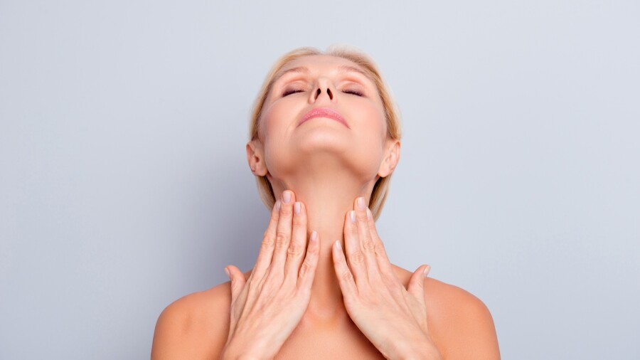 Например, можно намочить холодной водой полотенце и слегка «побить» себя по области под подбородком, передней поверхности шеи и в зоне декольте. Двойную пользу принесет морская соль, растворенная в холодной воде: смочите в этом растворе плотное полотенце и вперед!