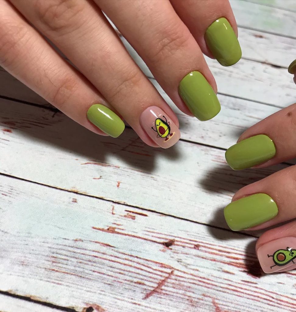 Летний период у всех ассоциируется с сочными фруктами и витаминами. Так почему бы не украсить этими плодами свой дизайн маникюра на короткие ногти лето в 2021 году? Сами рисунки не должны быть слишком мелкими. Желательно, чтобы они полностью занимали ногтевую пластину. Изображать на ноготках можно любые фрукты и ягоды. Наиболее популярным вариантом является долька арбуза или ломтик киви. Усовершенствовать такой маникюр вам помогут прозрачные гелевые капли, которые сделают оформление более объемным.