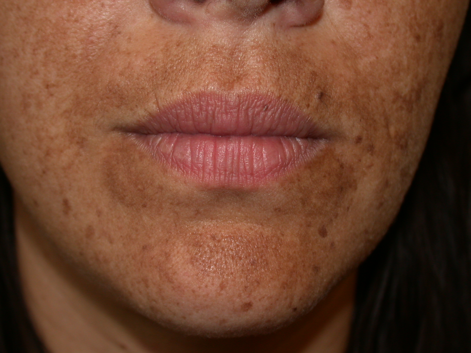 «Усы» и «бакенбарды». Гиперпигментация «обожает» проявляться вокруг рта — что создаёт у женщины эффект наличия волос там, где их нет или количество незначительно. Заниматься эпиляцией в этом случае бесполезно, «усы и бакенбарды» это пигментация на коже, а не наличие волос.