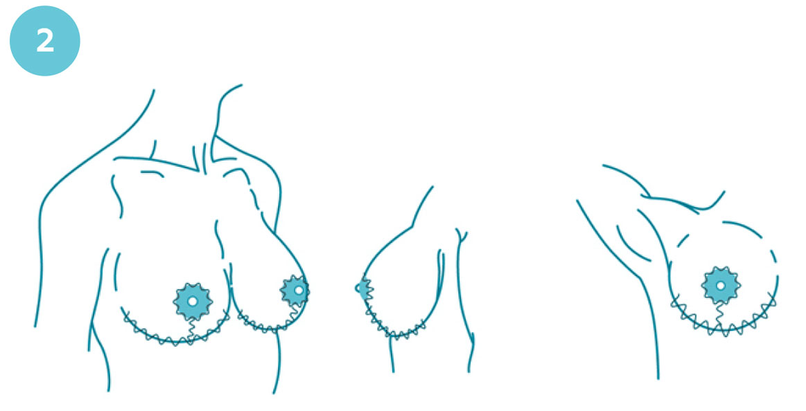 Излишки кожи удаляются по кругу ареолы. Следы от разрезов вокруг ареолы будут со-временем малозаметны.