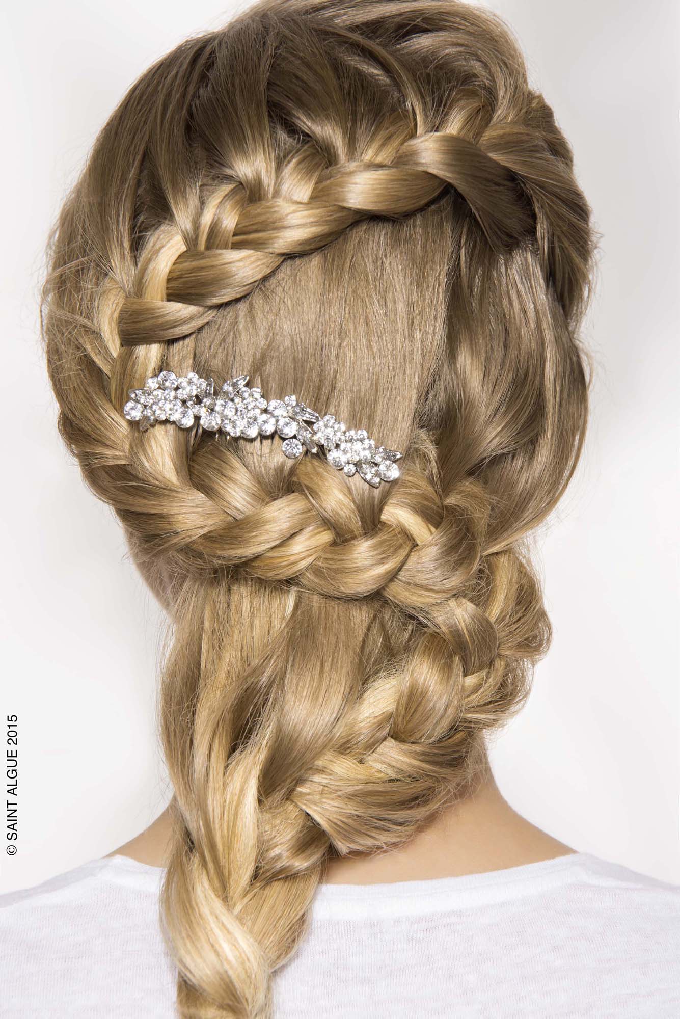 Когда создание кос закончено, их немного ослабляют по краям для придания объёма. После украшают плетение декоративными шпильками.