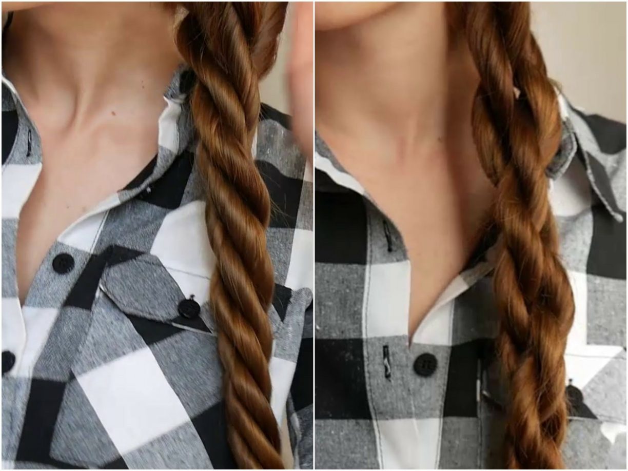 - Выполнив предыдущий пункт, переплетите этих два жгута между собой. Обязательно сплетайте в противоположном направлении, от того, в которое вы закрутили две части волос.