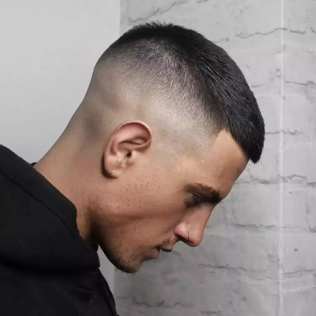Угасание — это переход от области виска к теменной области головы. Профессионалы выполняют машинкой и ножницами, укорачивают длину сверху, постепенно сводя ее к нулю в области виска. Зона за ушами гладко выбрита.