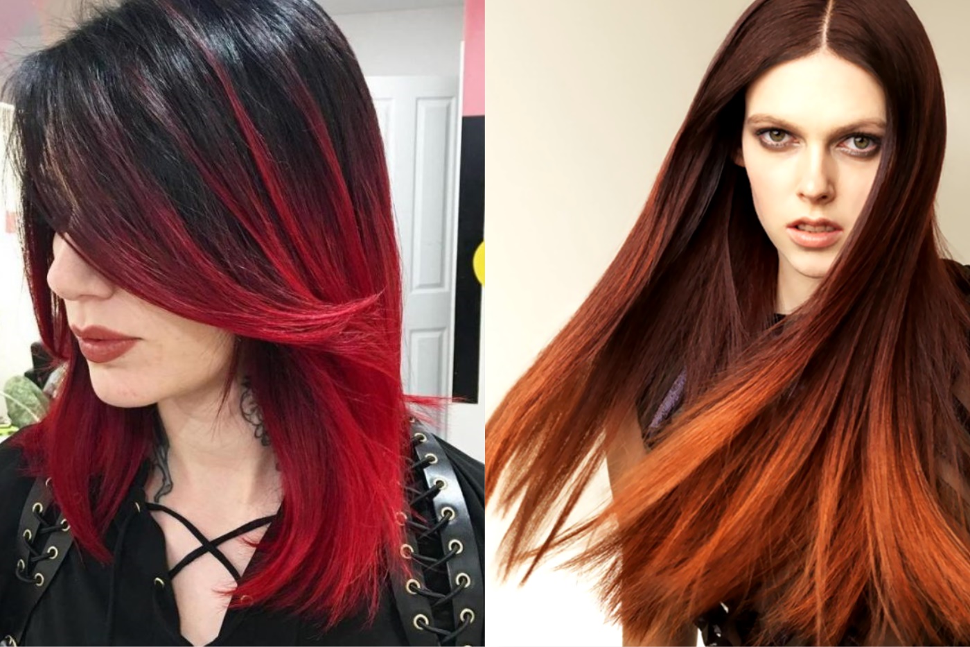 Красные и рыжие тона идеально подходят брюнеткам. Такое окрашивание предполагает весьма сильный контраст при переходе от корней к кончикам.
