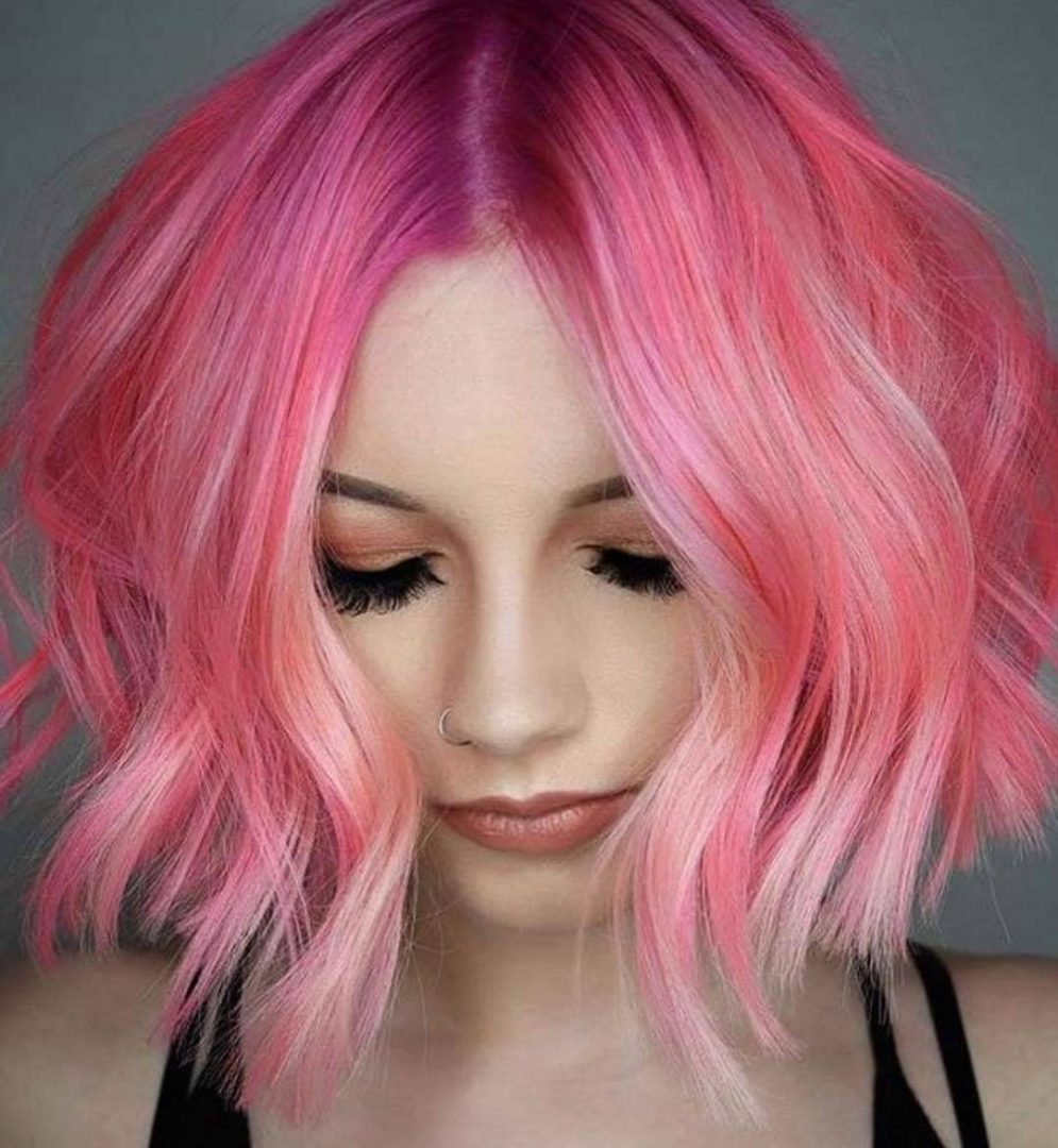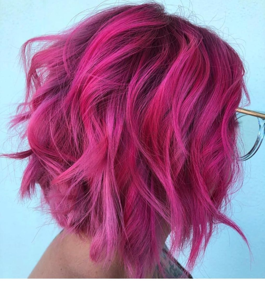 Очень смелый эксперимент, на который решается не каждая. Стоит сразу же отказаться от однотонного окрашивания. Насыщенный розовый может повести себя очень непредсказуемо и по-разному проявиться на волосах разного цвета, особенно если есть седина. Для яркого образа стоит выбирать частичное окрашивание. Будет хорошо смотреться не только на длинных, но и на коротких волосах.