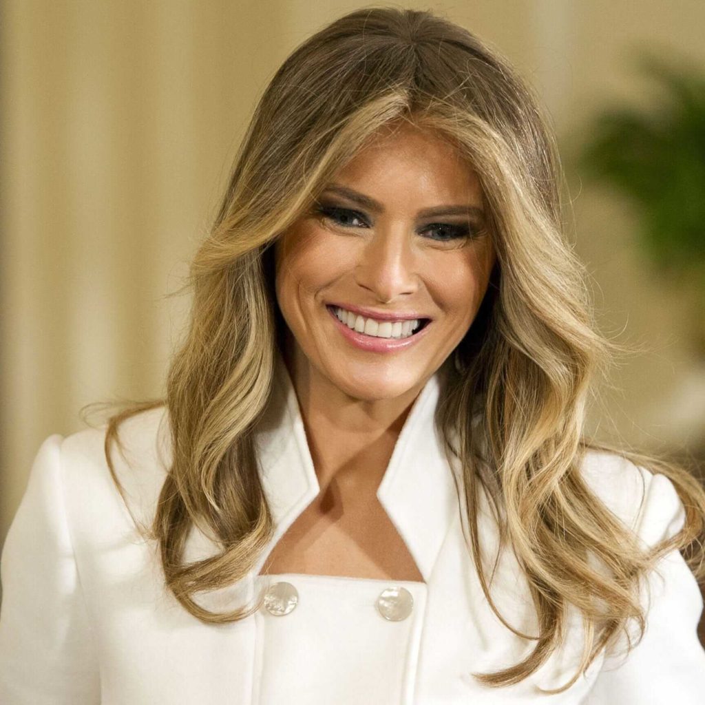 Her all-white ensemble perfectly accentuates Melania’s bronzed and glowing skin. Her tresses are slightly coiled back from her cheeks and parted softly off-center.