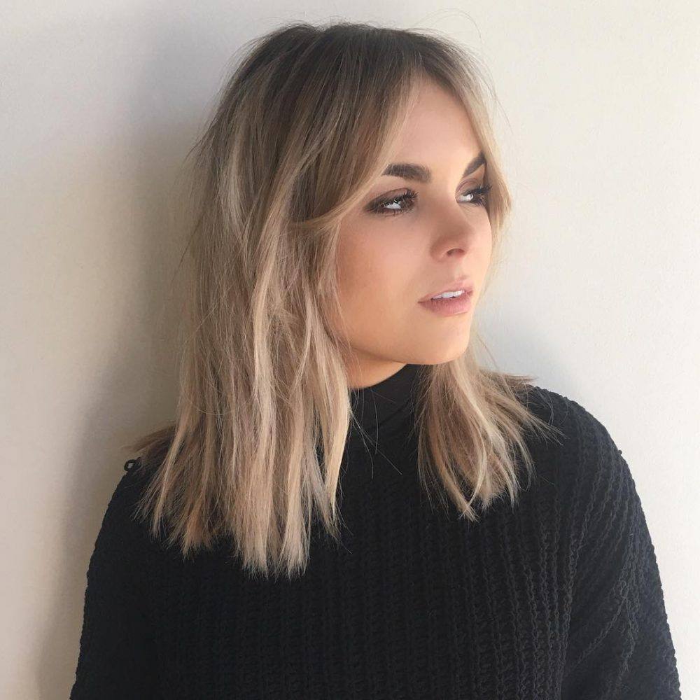 Для лиц такого типа, рекомендуем обратить внимание на прическу удлиненное каре с ровной челкой, чуть выше бровей. Такая стрижка с челкой способна спрятать довольно большой лоб и в то же время немного расширить лицо за счет волос по бокам