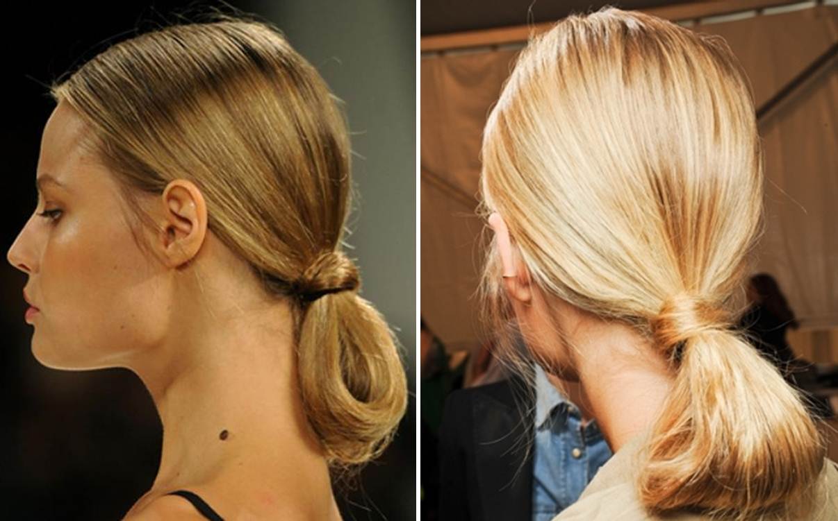Делаем низкий хвостик, зафиксируйте его при помощи резинки. Затем ослабьте и оттяните резинку немного вниз. Не распуская получившийся хвостик, разделите волосы, которые находятся выше резинки на две секции. В отверстие между обеими частями волос протяните конец хвоста. Слегка подправьте вывернутый хвостик.