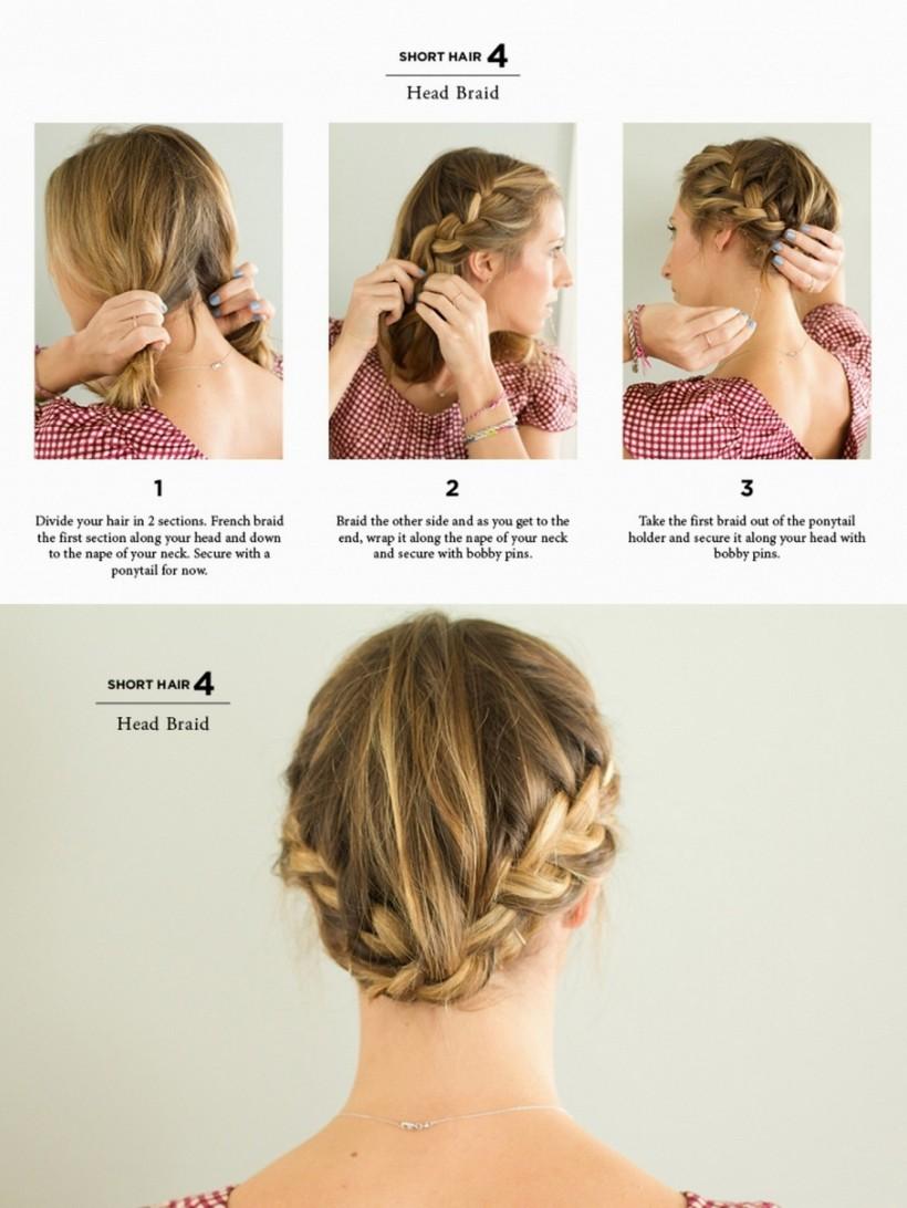 Вы удивитесь, но на короткие волосы можно сделать самой себе прическу высокой сложности. Например, распределите волосы на затылке на две половинки. Каждую из них используйте для французской косы. Концы закрепите на затылке, спрятав свободные пряди под противоположную косу.