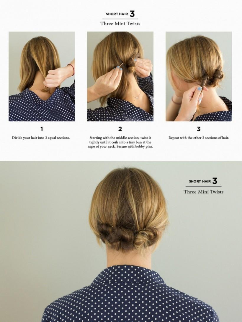 На самом деле, это вариант «гнезд», адаптированный для небольшой длины. Волосы делим на три равные части, начинаем работу со средней. Пряди скручиваем в жгут, а тот укладываем кольцом и закрепляем шпильками. Повторяем процедуру для соседних частей. В данном случае лучше прятать оставшиеся хвостики вовнутрь.