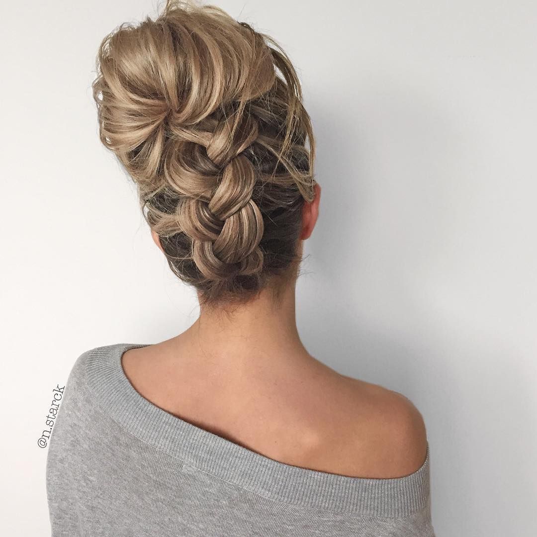 Добавление к пучкам плетений делает укладку более романтичной и праздничной. Очень красиво и нежно смотрится прическа с французской косой. Сделать такую прическу можно как на длинные волосы, так и на шевелюру средней длины.