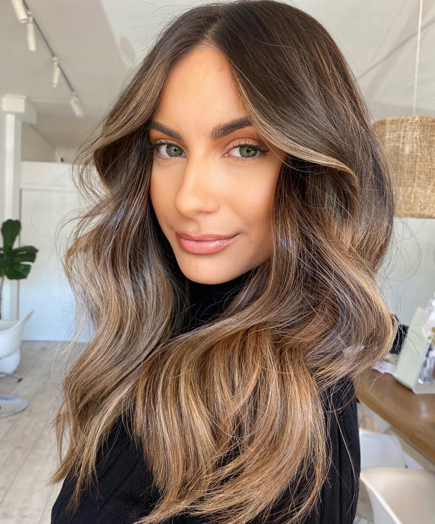 Сочетание в этом цвете золотого, бежевого и перламутрового подтона добавит волосам многогранность, благородную текстуру и визуальную густоту. Если ваша кожа имеет бронзовый оттенок, тогда вам отлично подойдет цвет волос «карамельный капучино»