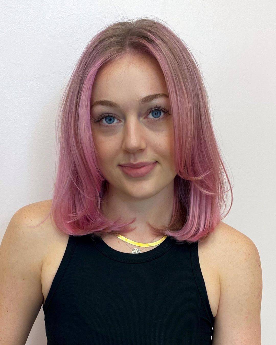 Прямые волосы средней длины оттенка розового «бабл-гам» с сочетанием темных корней – это идеальная альтернатива платиновому блонду, что в сочетании с бронзовым оттенком кожи гарантирует внимание со стороны мужчин