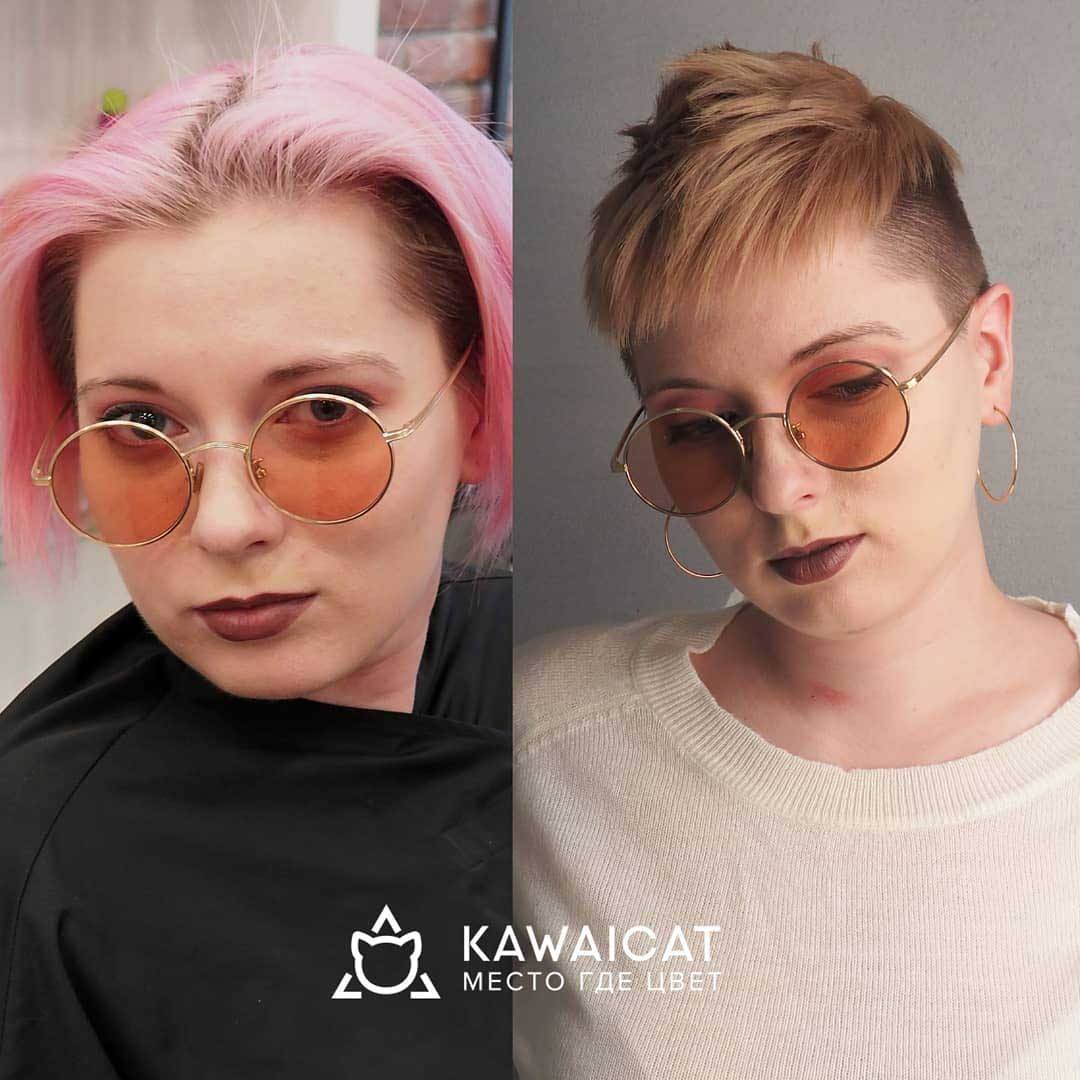 - Стрижка: на одной стороне головы часть прядей выбривается в височной зоне. Локоны стригутся полностью или выполняется «прическа», которую потом можно окрасить в розовый, голубой или другие яркие цвета. Прическу можно оставить набок, показывая свою наглость, или в нужный момент, разделив волосы пробором, скрывая «крайность».