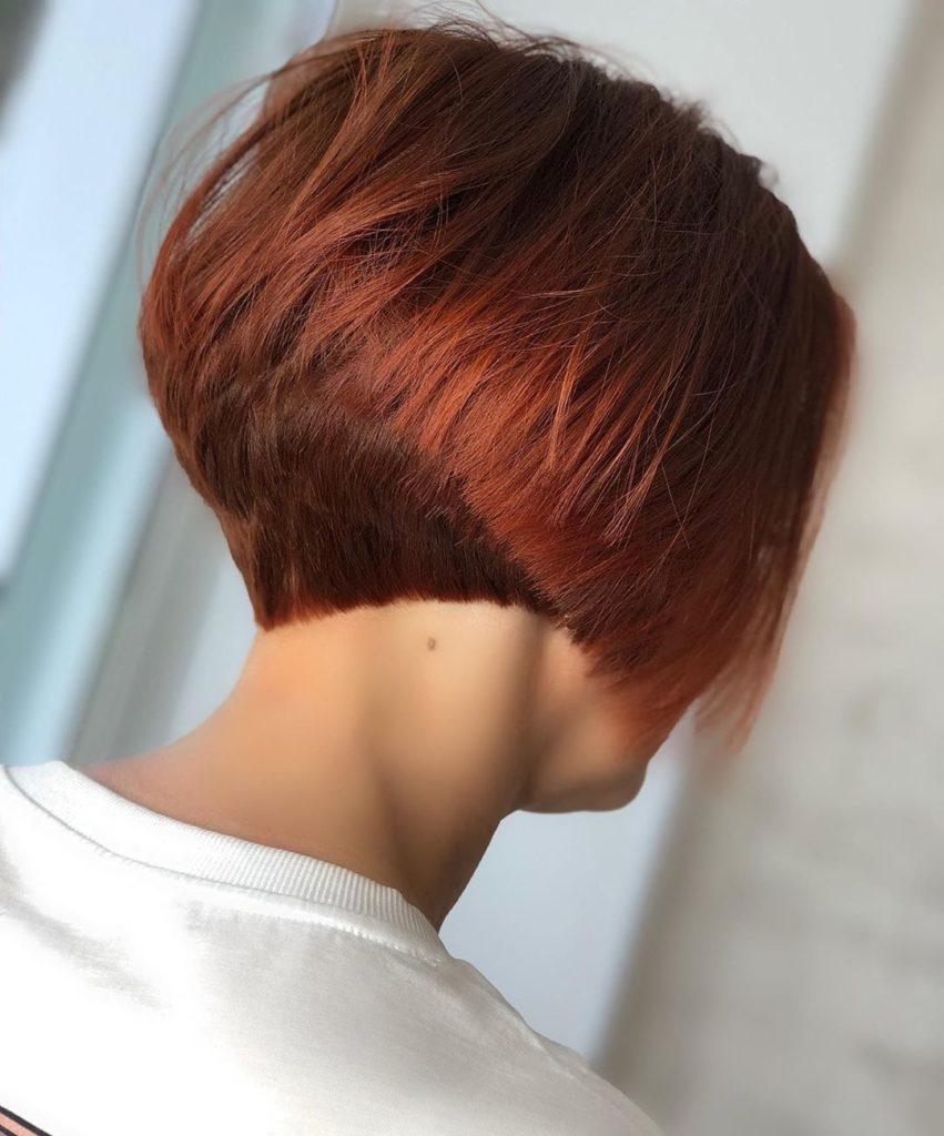Укороченное. Одним из самых необычных вариантов каре на ножке является укороченный вариант стрижки. Подобную стрижку обычно выбирают энергичные и дерзкие барышни. Затылок в данном случае максимально открыт и может доходить до середины головы