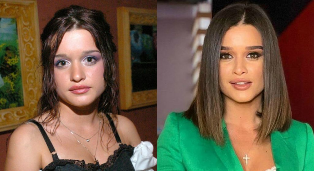 Образ Ксюши в 2000-х годах: полная фигура, широкое лицо, длинные темные волосы и яркий безвкусный макияж.