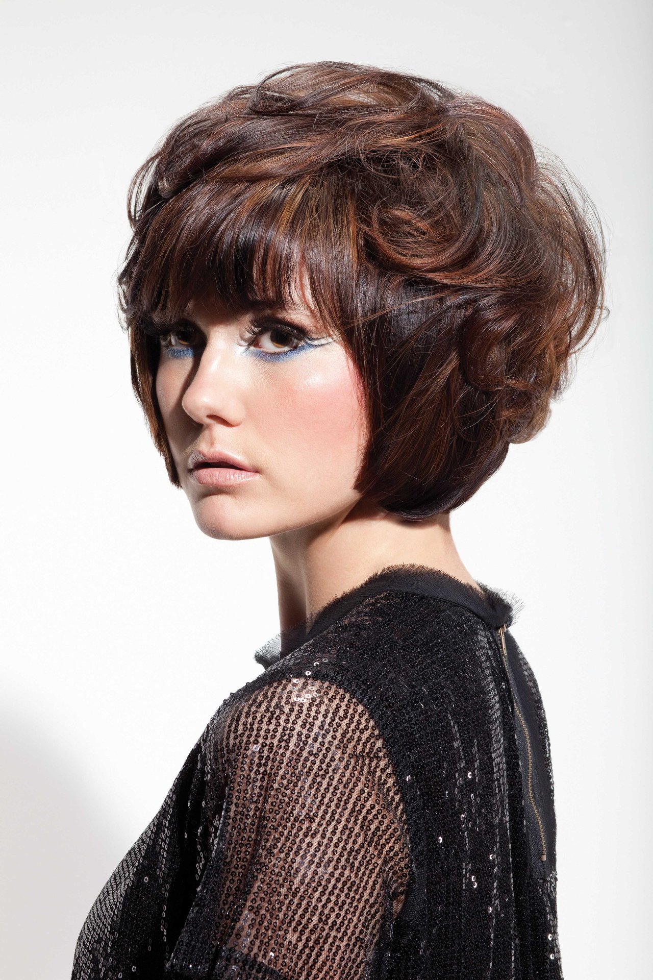 Изюминкой прически являются укороченные передние и боковые локоны, а также пышная объемная шапочка на макушке.