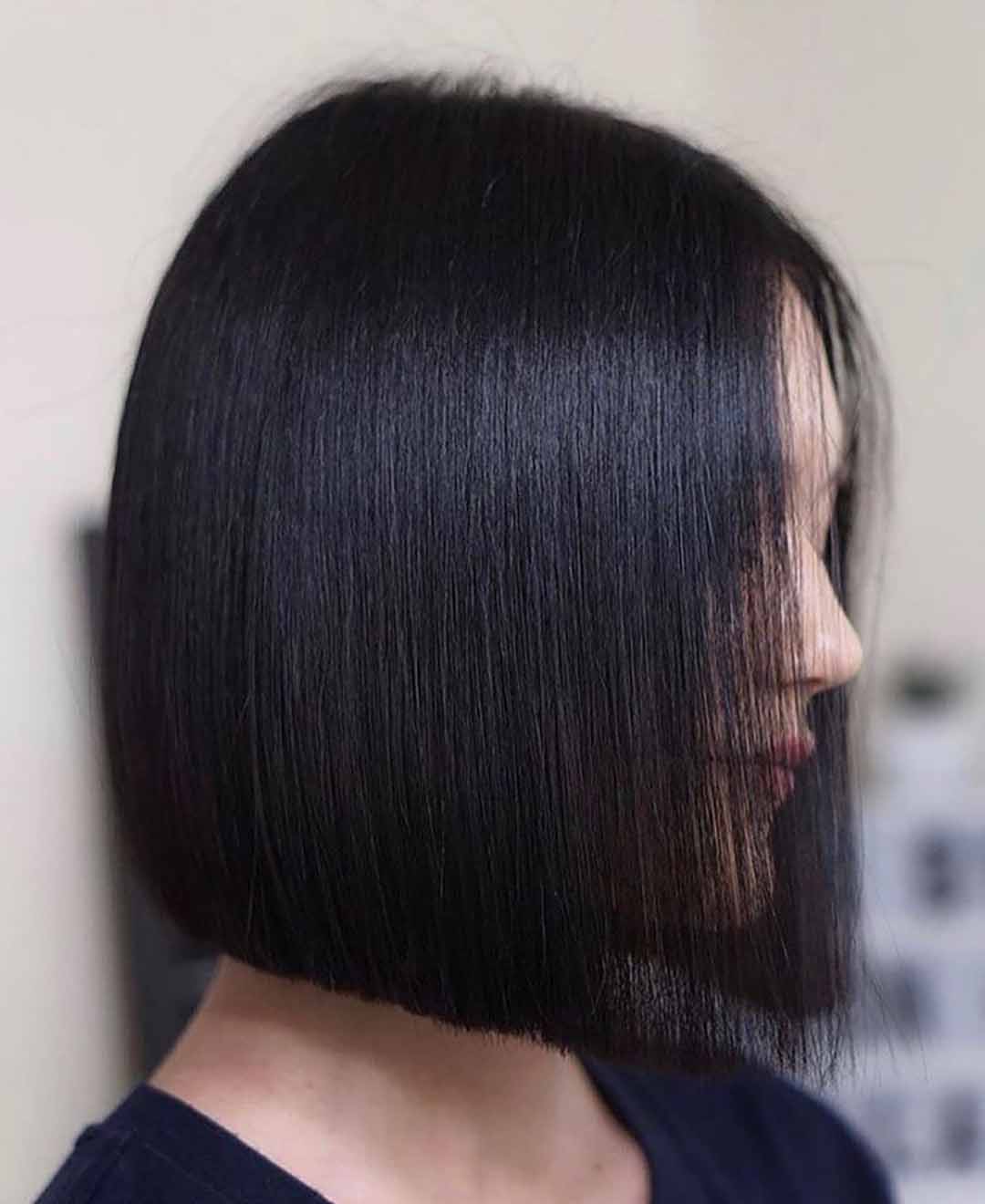 Вид сзади – короткая длина, открывающая шею, а далее плавный переход к длинным прядям до подбородка;• в моде короткие варианты с удлинением передних прядей, которым придают асимметричный вид;• классическая прямая челка придаст образу моложавости, прикроет некрасивую линию бровей и акцентирует внимание на красоте и выразительности глаз;• в тренде стильные идеи с косой челкой, которые гарантируют неповторимый образ. Поощряется креативный подход к контуру каре с длинной косой челкой.