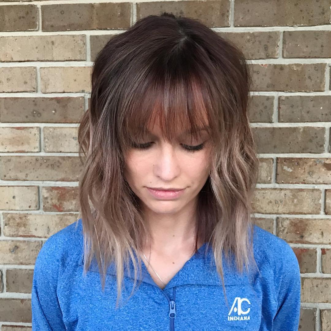 Боковые челки – это фантастический способ добавить визуальный угол к вашей форме лица, сохраняя при этом лоб и брови открытыми. Хотя этот тип челки может быть довольно гибким с точки зрения длины и текстуры, мы хотим, чтобы вы сосредоточились на комбинации боковой челки и каре средней длинны. Эти челки не только органично сочетаются с остальной частью волос, но и служат прекрасным дополнительным элементом к их внешнему виду. Чтобы воссоздать этот стиль, вам нужно сделать слегка многослойную стрижку.