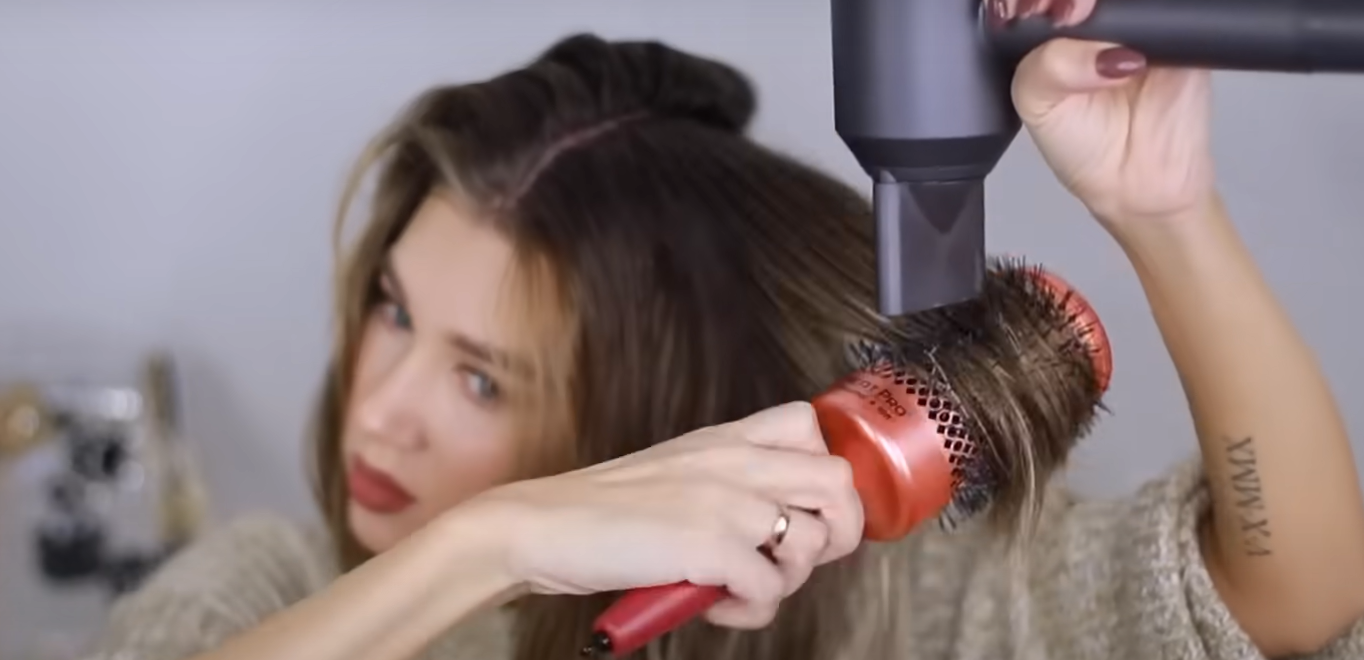 Чуть влажные локоны разделяют на две половины (верхнюю и нижнюю). Нижние локоны накручивают на круглую щётку и просушивают феном, после повторяют действия с верхними прядями. Зачёсывают волосы на одну сторону или оставляют с прямым пробором.