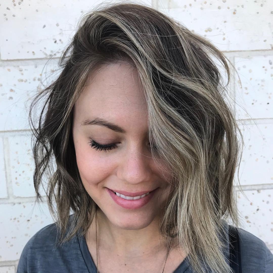 Беспорядочный боб сейчас очень популярный. Этот неряшливый слоистый боб с челкой очень милый. Темные корни, которые плавно переходят в светлые волосы придают этому игривому, короткому стилю множество текстуры и глубины, а беспорядочные волны делают его очень сексуальным и соблазнительным.
