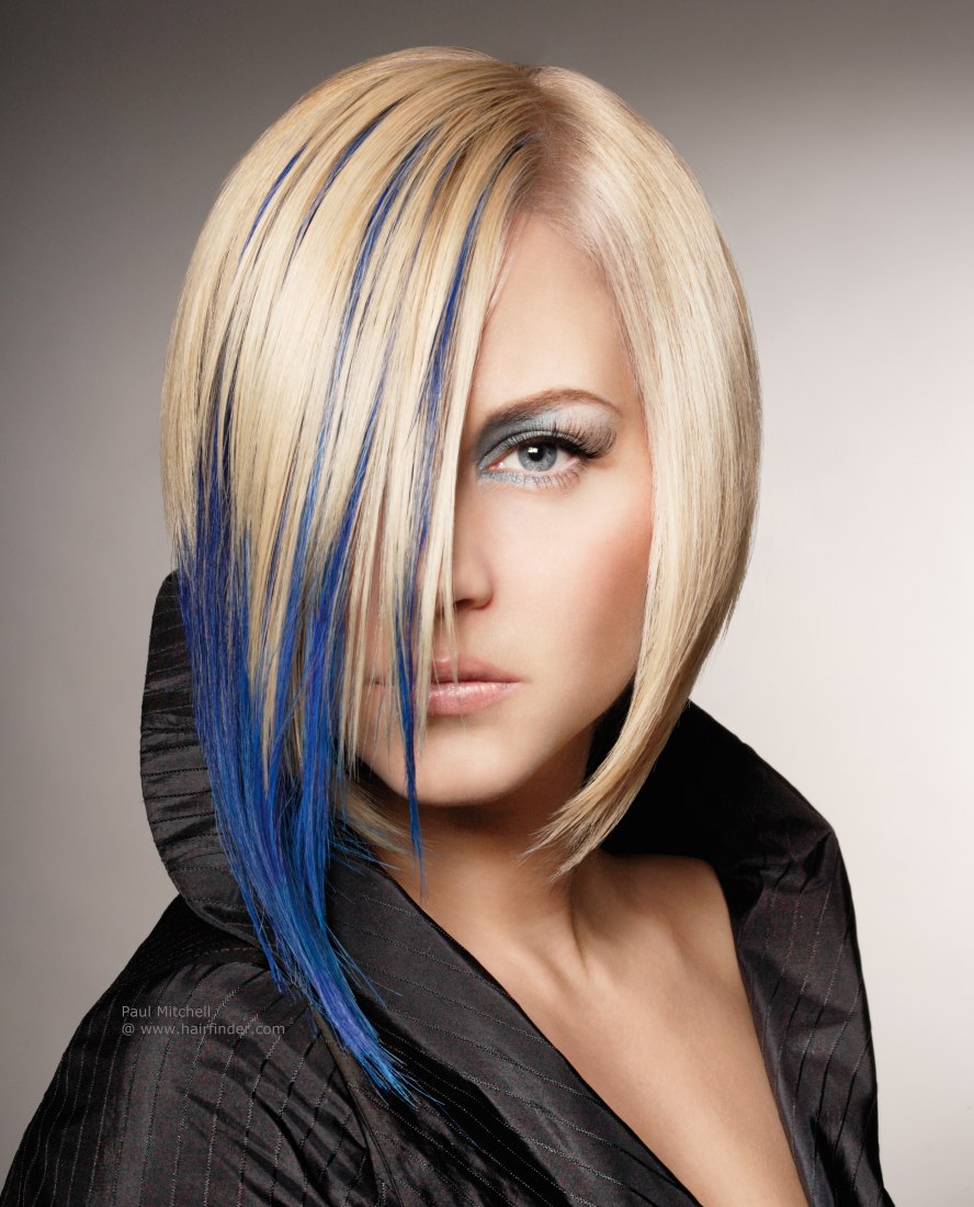 Нестандартная, немного странная, но очень модная прическа благодаря оформлению челочки под заостренным углом. Такая креативная прическа преобразит смелых девушек с послушными волосами.