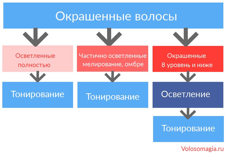 В зависимости от цвета волос, получившегося после осветления, необходимо использовать разные формулы для окрашивания. После осветления цвет может быть красноватым, рыжеватым или желтым. При наличии рыжего или красного оттенка необходимо осветлить волосы еще раз, пока цвет не получится желтым или очень светло-желтым. Делать это лучше через 2-4 недели, а пока затонировать волосы в промежуточный оттенок (русый, светло-русый).