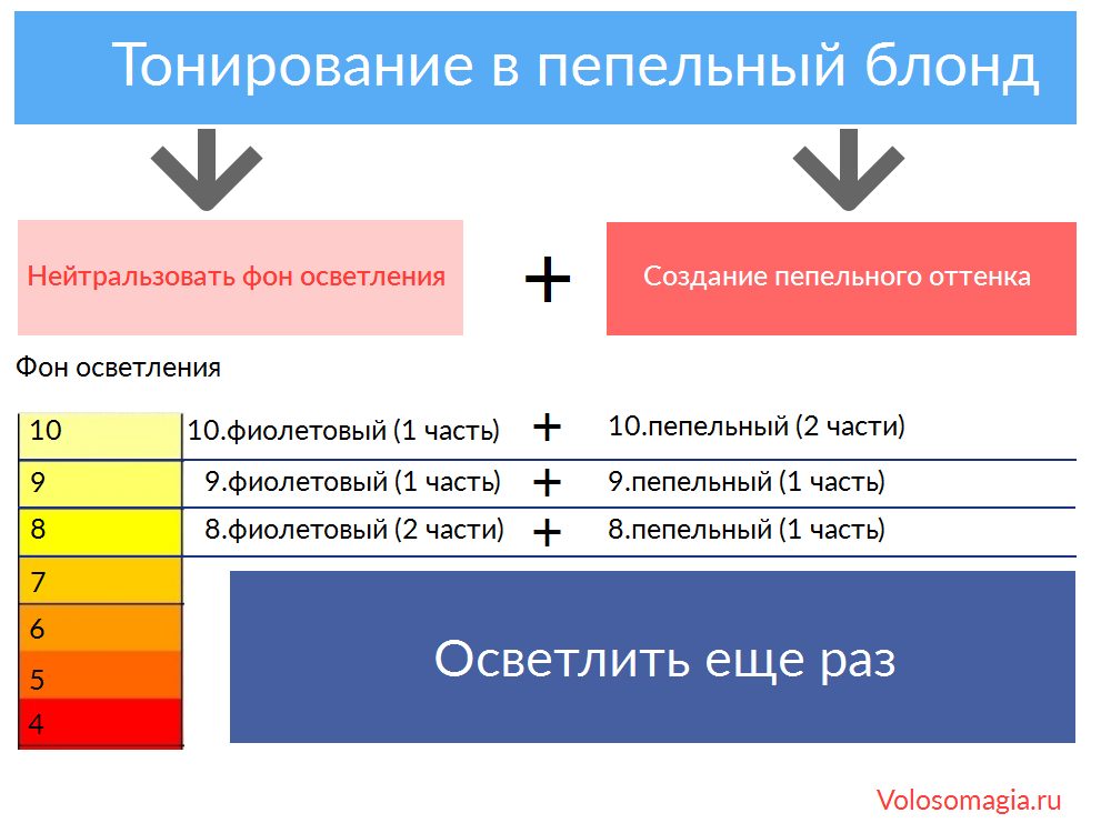 Примечание: это самые базовые формулы тонирования в пепельный оттенок блонда. Существует множество вариаций с микстонами, несколькими дополнительными оттенками и множество ньюансов, появляющихся при работе с красителями разных производителей. Но эти базовые формулы помогают не запутаться, учесть нейтрализацию желтизны и получить красивый платиновый цвет.