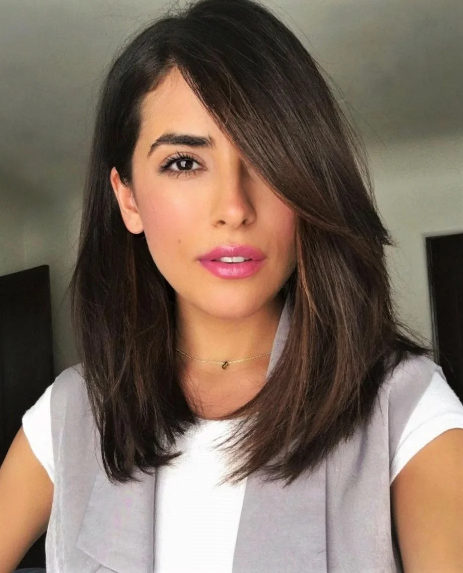 Косая чёлка подойдёт к ассиметричным чертам лица. Таким образом, делаем акцент на красивых скулах или глазах.