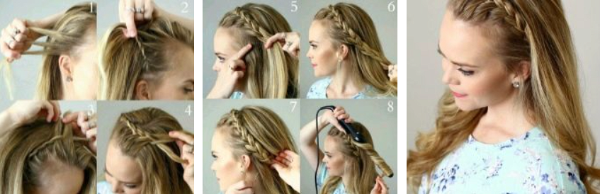 Для создания такой прически нужно зачесать все волосы назад и с одной боковой стороны выделить локон и разделить его на три пряди для плетения косы в направление к противоположному виску. Чтобы прическа получилась аккуратнее можно выделить волосы по горизонтальной линии вдоль линии роста волос.