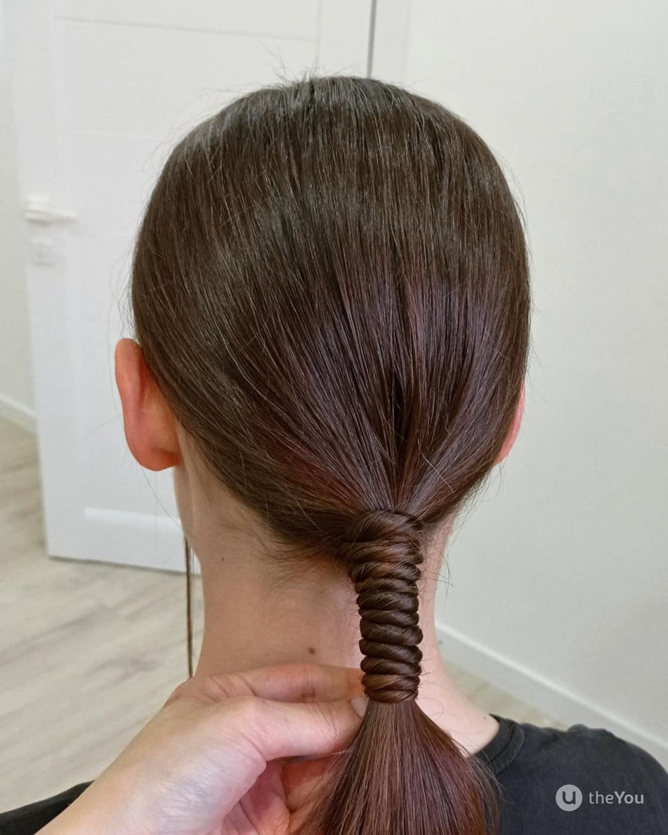 - По мере скручивания оборачивайте жгут вокруг резинки в том направлении, в котором волосы скручиваются в жгут.